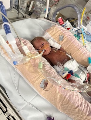 At just five days old, doctors transferred the fragile baby to South Brisbane’s Mater Mother’s Hospital for specialist neonatal care and surgery to repair a perforated bowel.